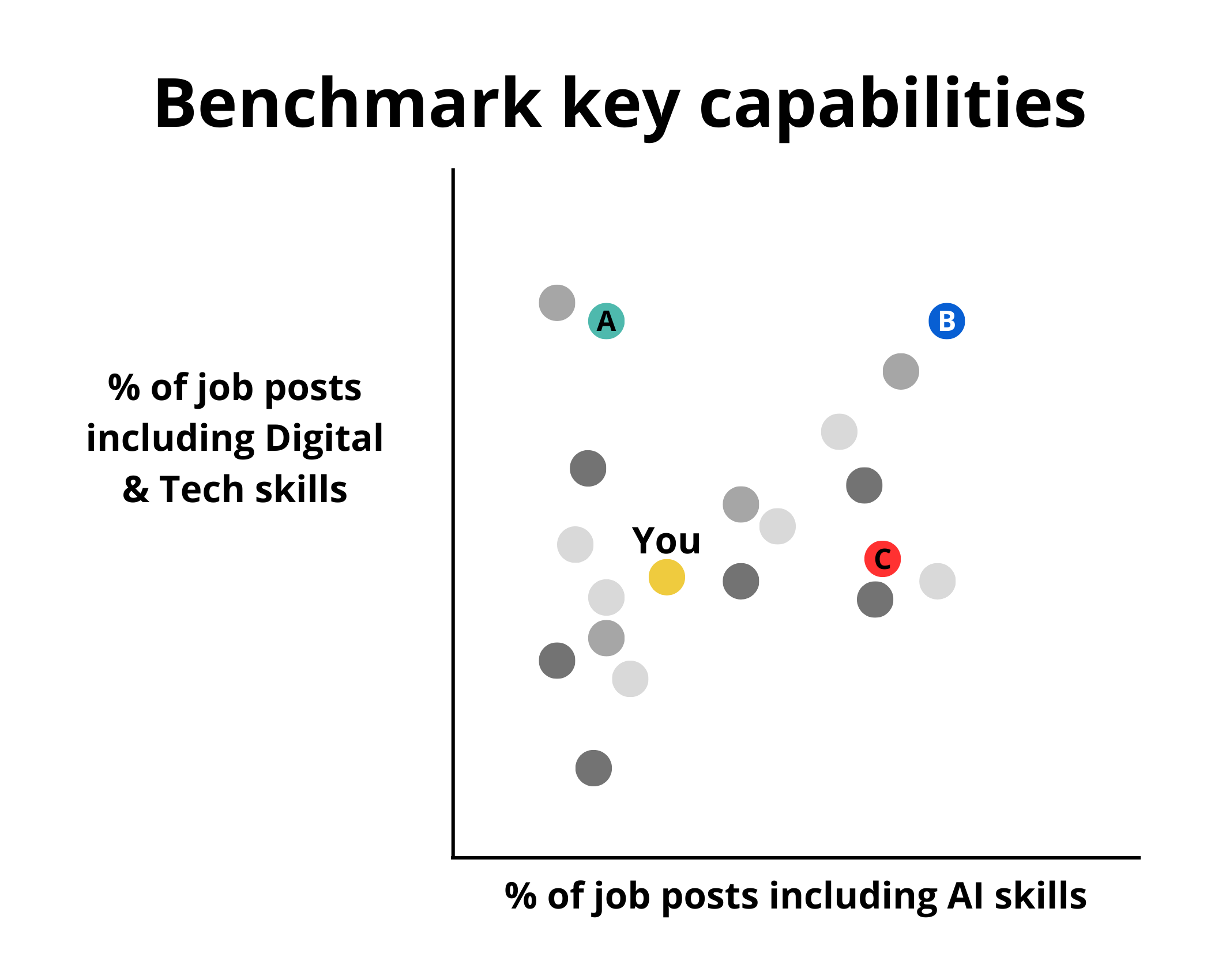 Prioritised critical skills: Pinpointed emerging and fast-growing skills for potential investment. Pulled out specific competitor examples showing how priorities differ across their peer group, giving them compelling evidence to create a clear L&D roadmap.